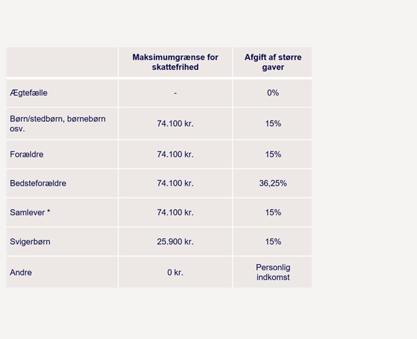 Tabellen viser, hvor meget man kan give i skattefrie pengegaver, i 2024. Den viser også, hvor meget man skal betale i gaveafgift, hvis man giver mere end beløbsgrænsen for skattefrie pengegaver.