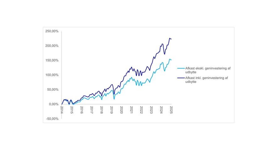 Ser vi på det globale aktieindeks, har det også været en fordel at geninvestere udbytterne. Over en periode på 11 år har afkastet været omkring 223 pct., hvis udbytterne blev geninvesteret. Uden geninvestering af udbytterne var afkastet godt 152 pct.